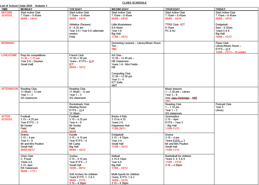 Several before and after school clubs have a limited number of places and some only run at certain times of the year.   Once your child has joined a club they are expected to attend regularly.  Where clubs are oversubscribed a waiting list will be kept.
